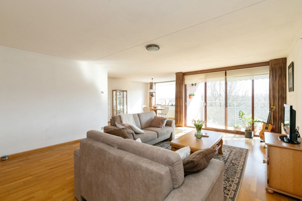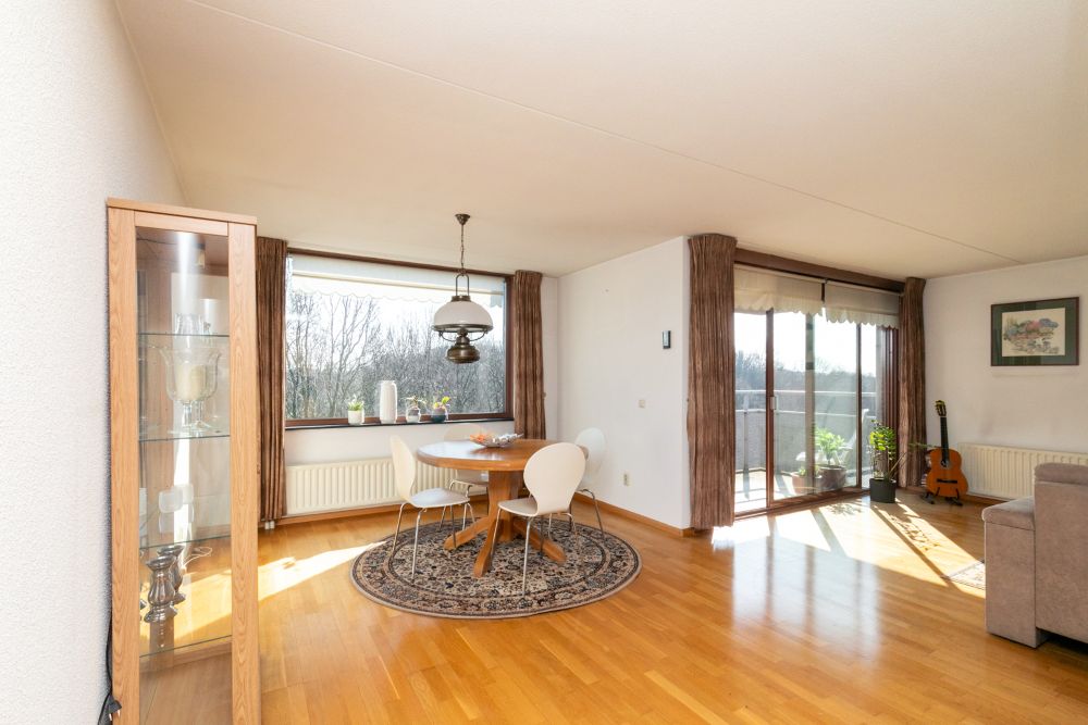 De woonkamer is royaal opgezet met een duidelijk zit- en eetgedeelte. Via de grote schuifpui bereikt u het balkon waar u heerlijk kunt genieten van de zon en het prachtige uitzicht over het groen.