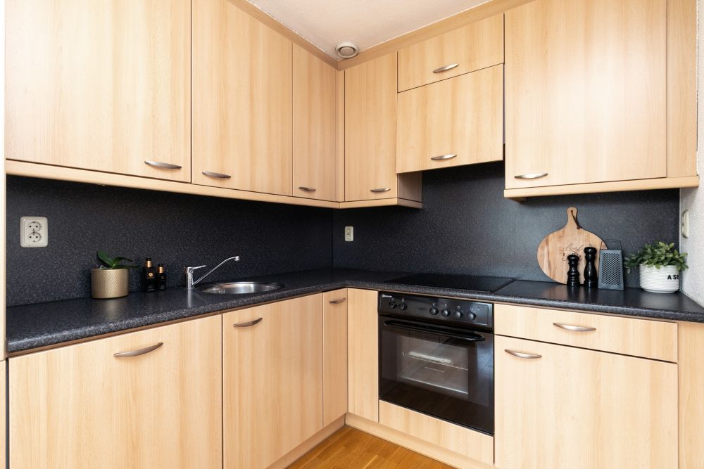 Semi-open hoekkeuken met praktische indeling met veel opbergruimte en onder andere voorzien van vaatwasser, koelkast met 3 vriesladen en kookplaat.