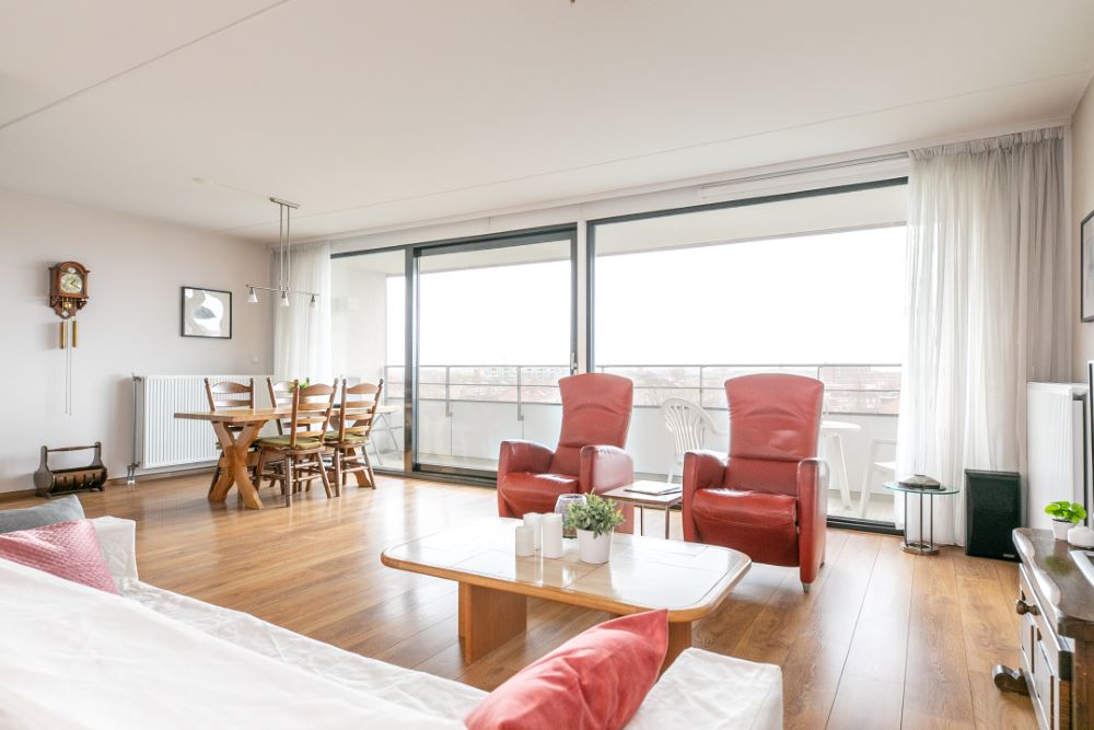 – riante living van 43 m² met laminaatvloer, schuifpui naar royaal balkon met een fantastisch uitzicht over het centrum en het zuiden van Breda. Door de grote ramen en balkons op het Zuiden komt het licht je overal tegemoet.
