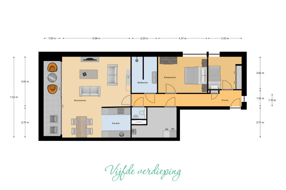 – Een groot balkon (ca. 1,5 x 7,2 m.) over de volledige breedte op het Zuiden zodat je ruimte hebt voor een eet- en zithoek.