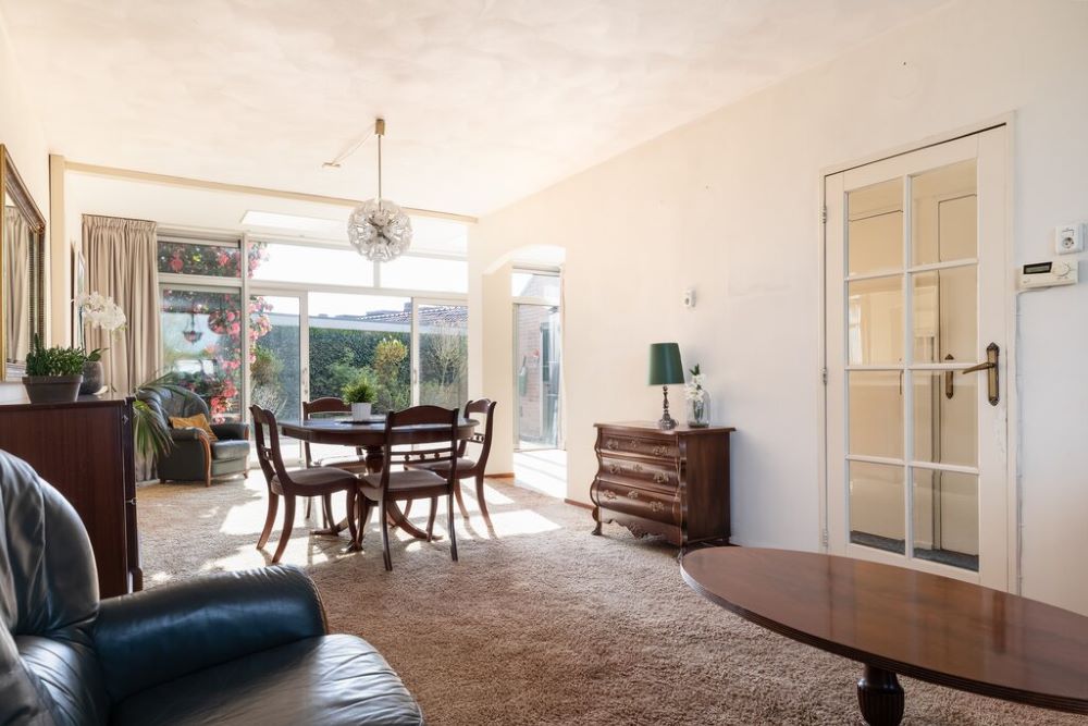 De woonkamer (ca. 3,5 x 9,7 m.) is voorzien van fijn lichtinval door de vele raampartijen. Aan de voorzijde heb je mooi uitzicht op een breed grasveld met bomen en door de ligging van de voortuin heb je weinig inkijk. De achterzijde heeft een uitbouw met 2 lichtkoepels (uit 2001) met onderhoudsvriendelijke aluminium kozijnen met een dubbele schuifpui die toegang biedt tot de zonnige achtertuin.