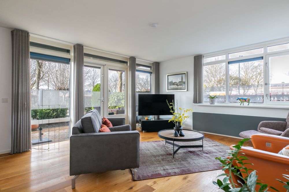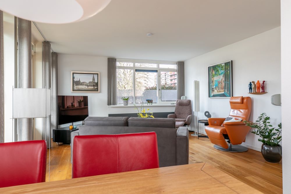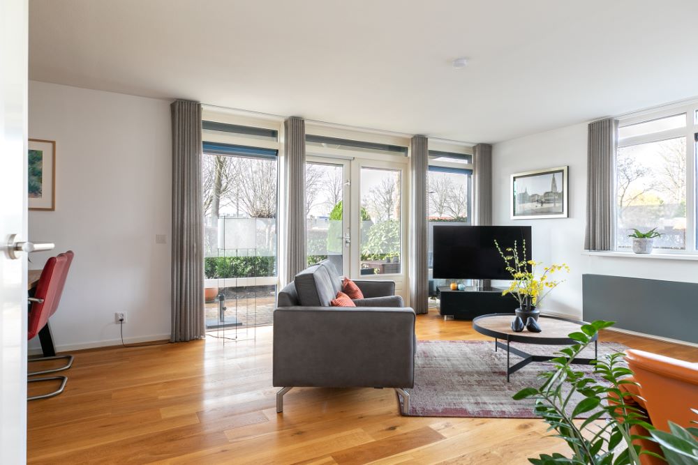 Mooie woonkamer van ca. 27 m² (ca. 7,7/5,0 x 4,2 m.) met veel lichtinval door de grote raampartijen en toegang tot de semi open keuken. De woonkamer en open keuken zijn voorzien van dezelfde nette parketvloer. De ramen aan terraszijde zijn voorzien van op afstand bedienbare screens.