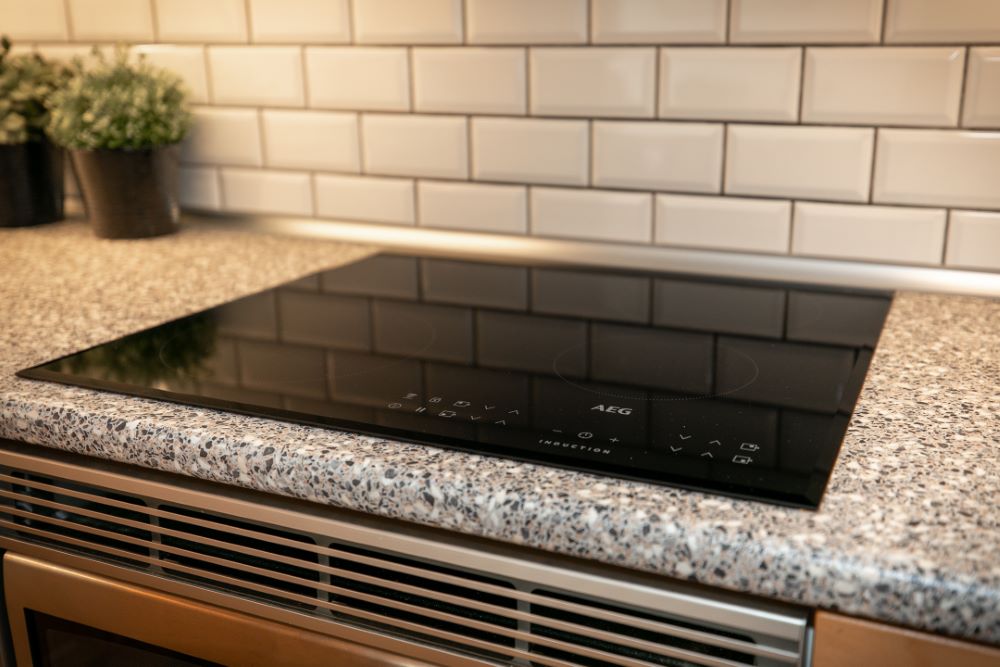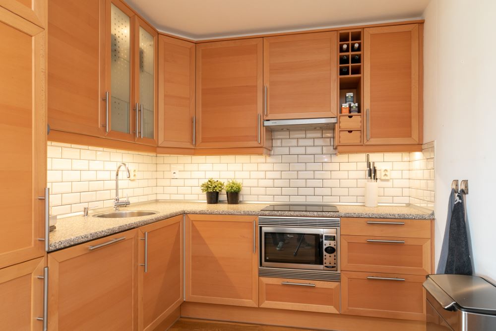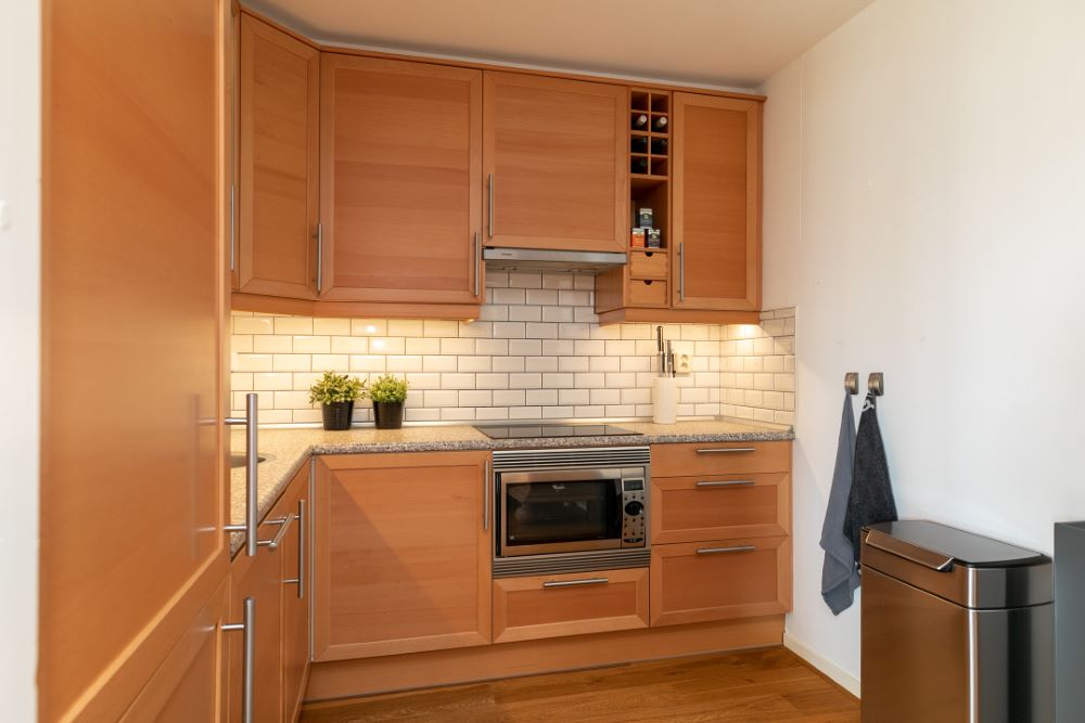Semi open keuken (ca. 2,5 x 2,5 m.) in hoekopstelling met onder andere een combi-oven, koel/vries combinatie, AEG inductie kookplaat, vaatwasser en voorzien van diverse boven- en onderkastjes en spoelbak.