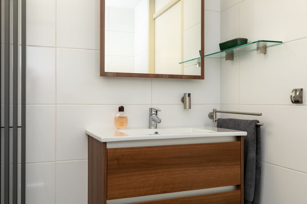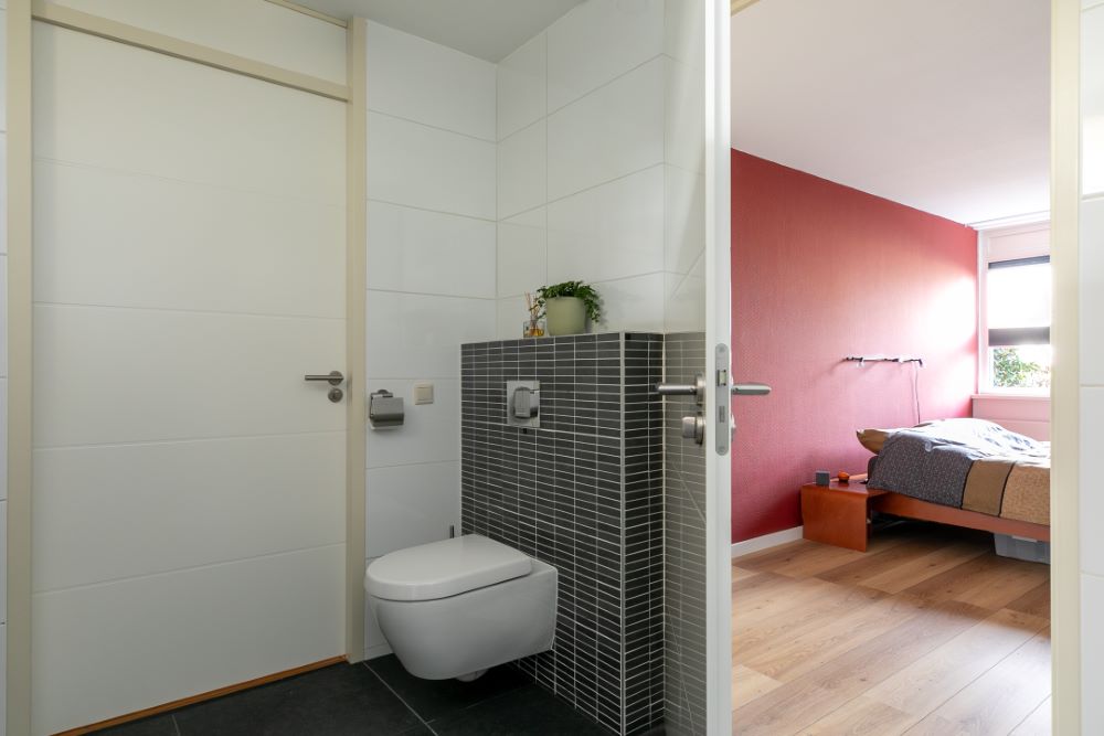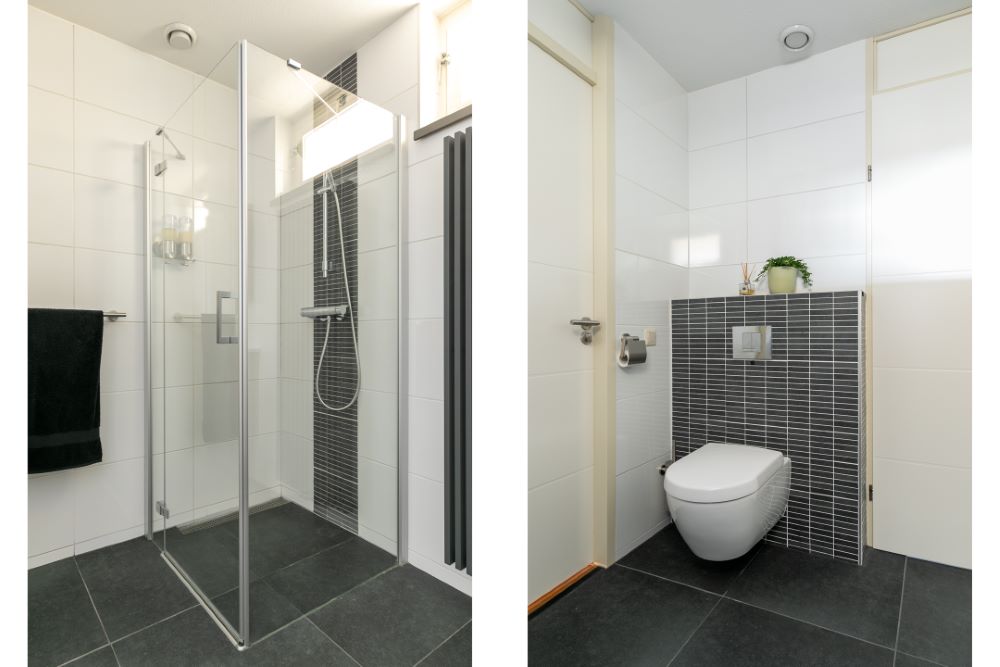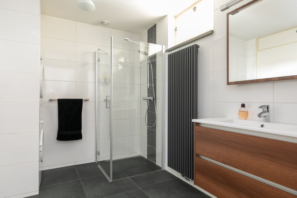 De royale moderne badkamer (ca. 2,4 x 3,0 m.) is voorzien van een douchehoek, wastafelmeubel met spiegel, designradiator, wasmachine aansluiting en zwevend toilet. Je kan deze badkamer vanuit de hal maar ook vanuit hoofdslaapkamer 1 bereiken.