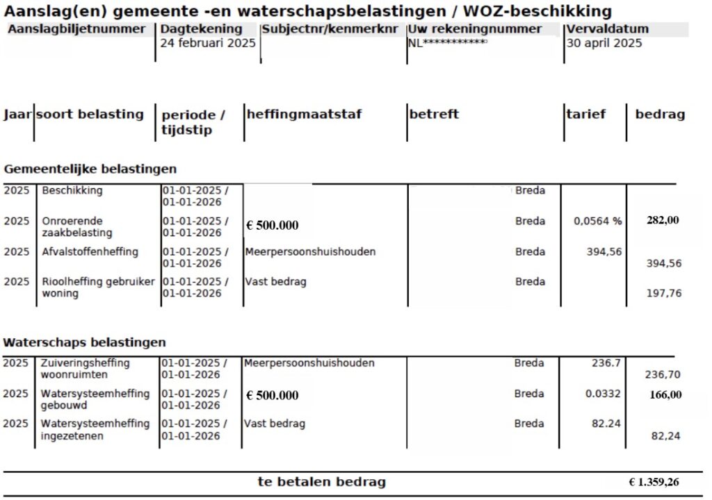 Op je aanslagbiljet van de gemeente Breda zie je meestal deze posten: