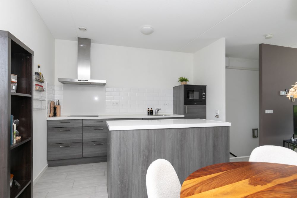 Moderne open keuken voorzien van luxe inbouwapparatuur (inductiekookplaat, afzuigkap, vaatwasser, combi-oven uit 2024, koelkast). Het eiland staat los en is dus verplaatsbaar.