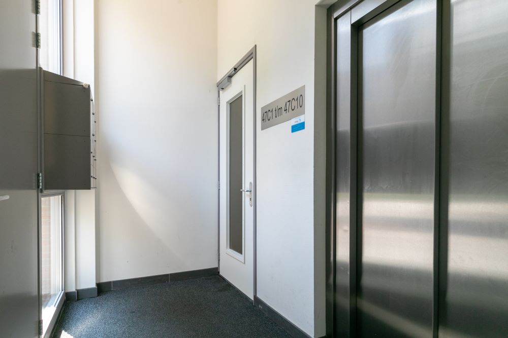 Centrale entree met bellentableau met video intercominstallatie. Via het trappenhuis en de liftinstallatie is de op de derde en vierde gelegen stadswoning/maisonnette te bereiken.
